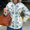 Nieuw product hete verkoop 49% korting❤️🔥Blauwe ronde hals bedrukte katoenen bovenkleding met riem